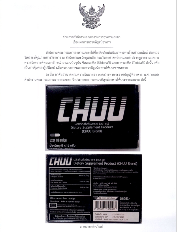 ข่าวประกาศผลการตรวจพิสูจน์อาหาร อย. ตรวจพบซิลเดนาฟิล ในผลิตภัณฑ์เสริมอาหารชนิดแคปซูล ตรา ซูสส์